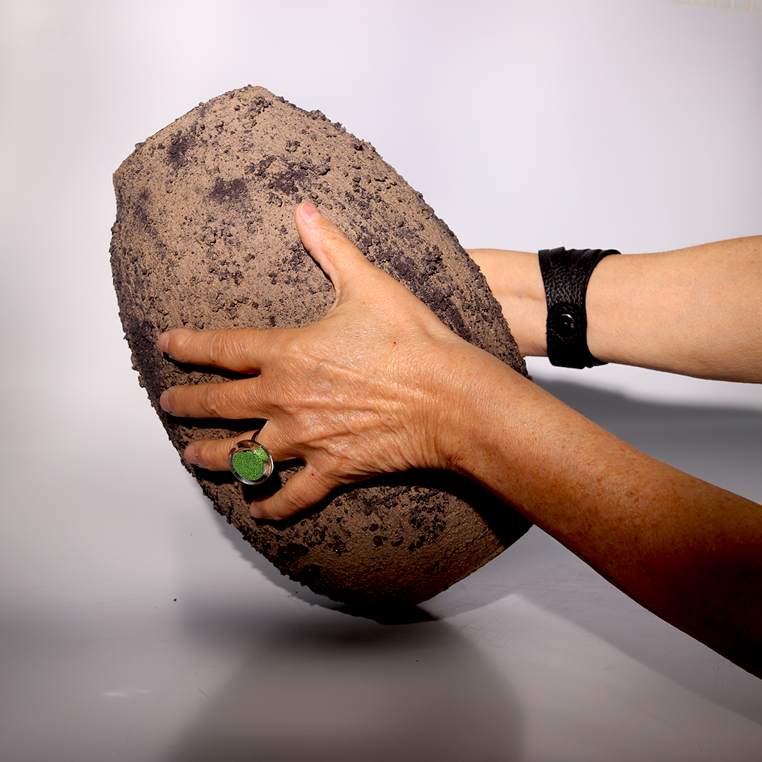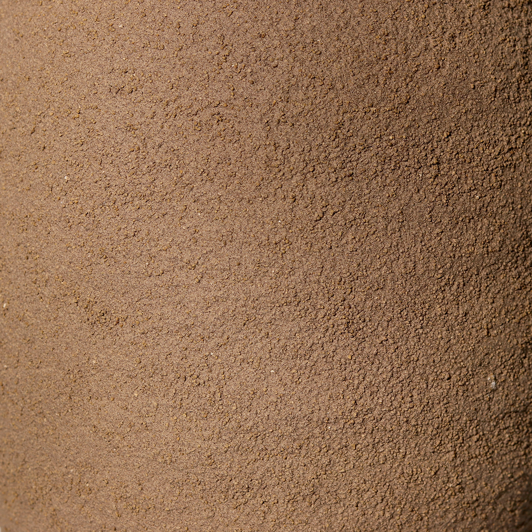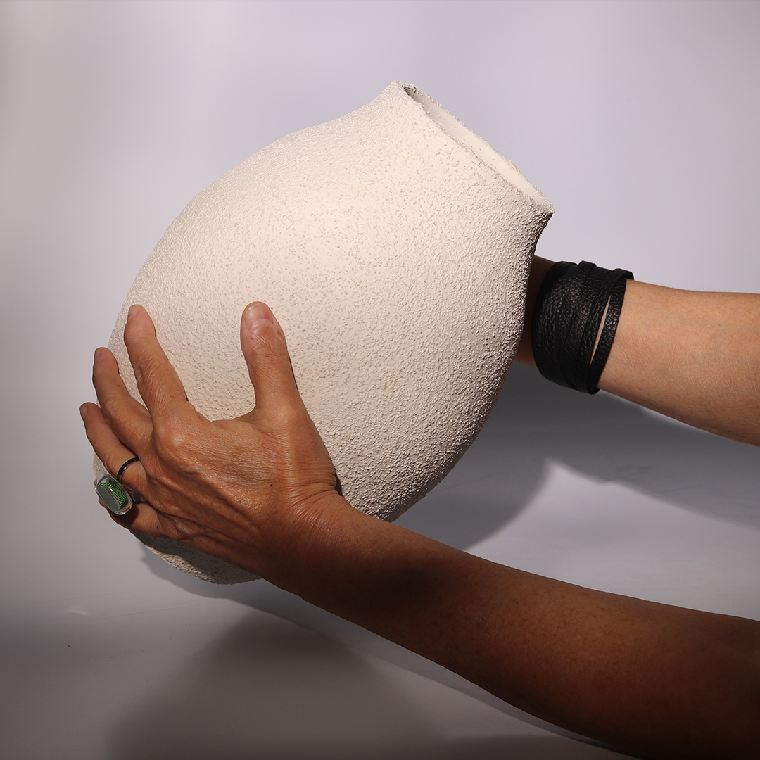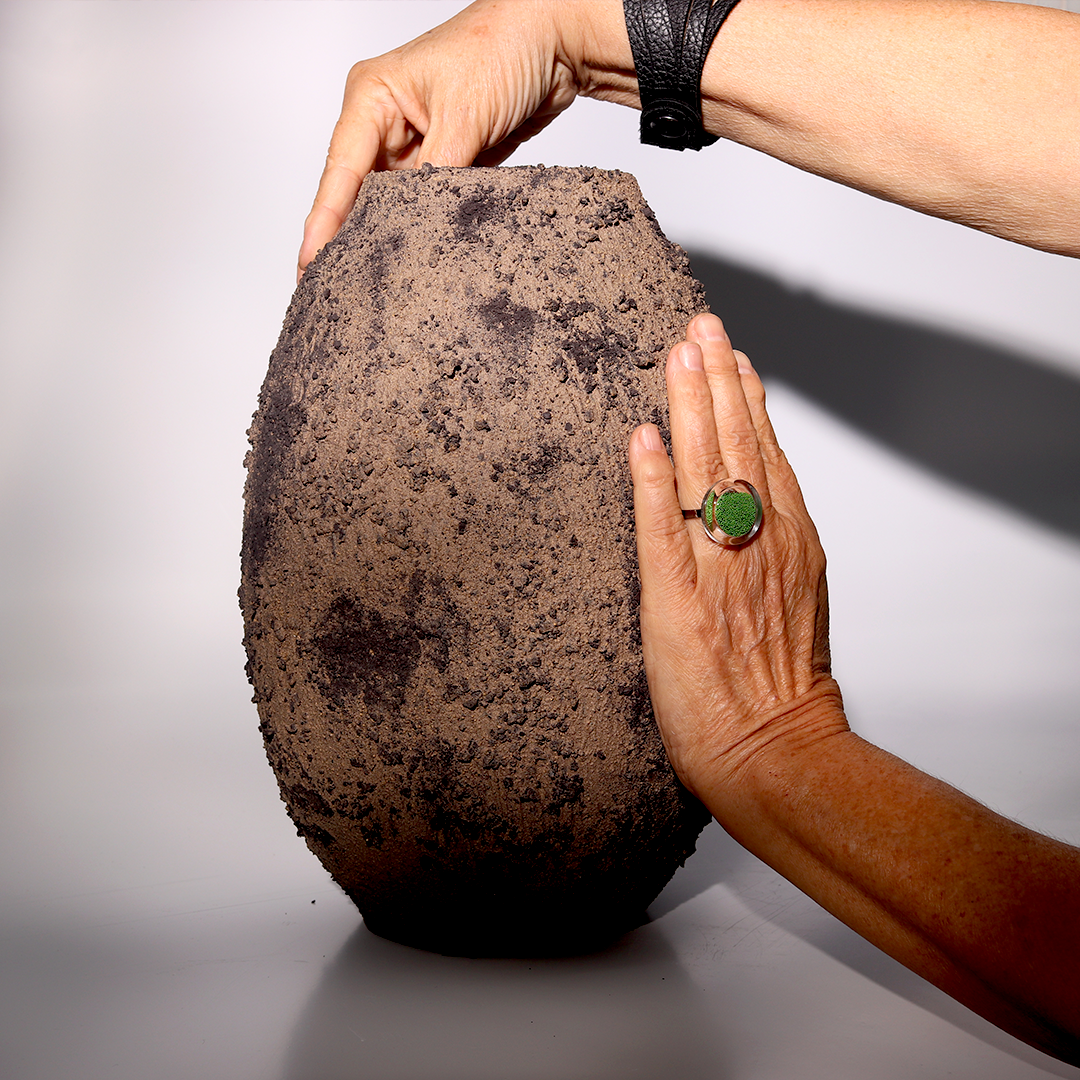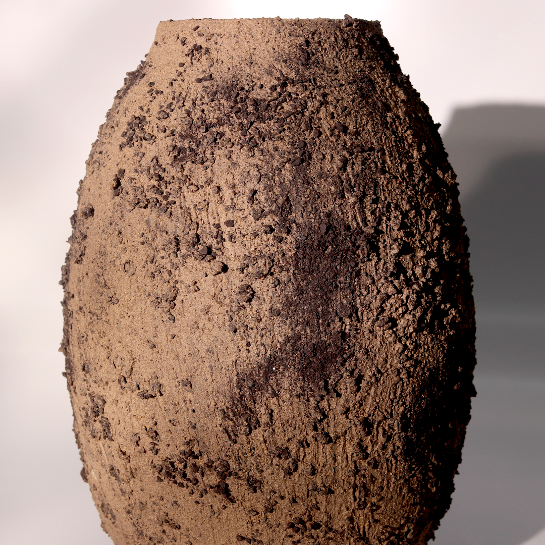 plural e resistente, o vaso texturizado com minerais tem acabamento orgânico.